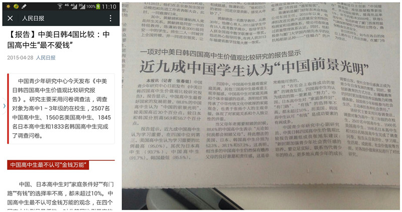 2015年4月28日,《中美日韩四国高中生价值观比较研究报告》正式发布,《光明日报》《人民日报》《中国教育报》等第一时间在官网或纸质版上进行了报道。截止5月4日14时,《人民日报》的相关报道阅读量达32002。目前,《中国青年报》《人民政协报》《现代教育报》《中国妇女报》等媒体还在联系深入采访报道。